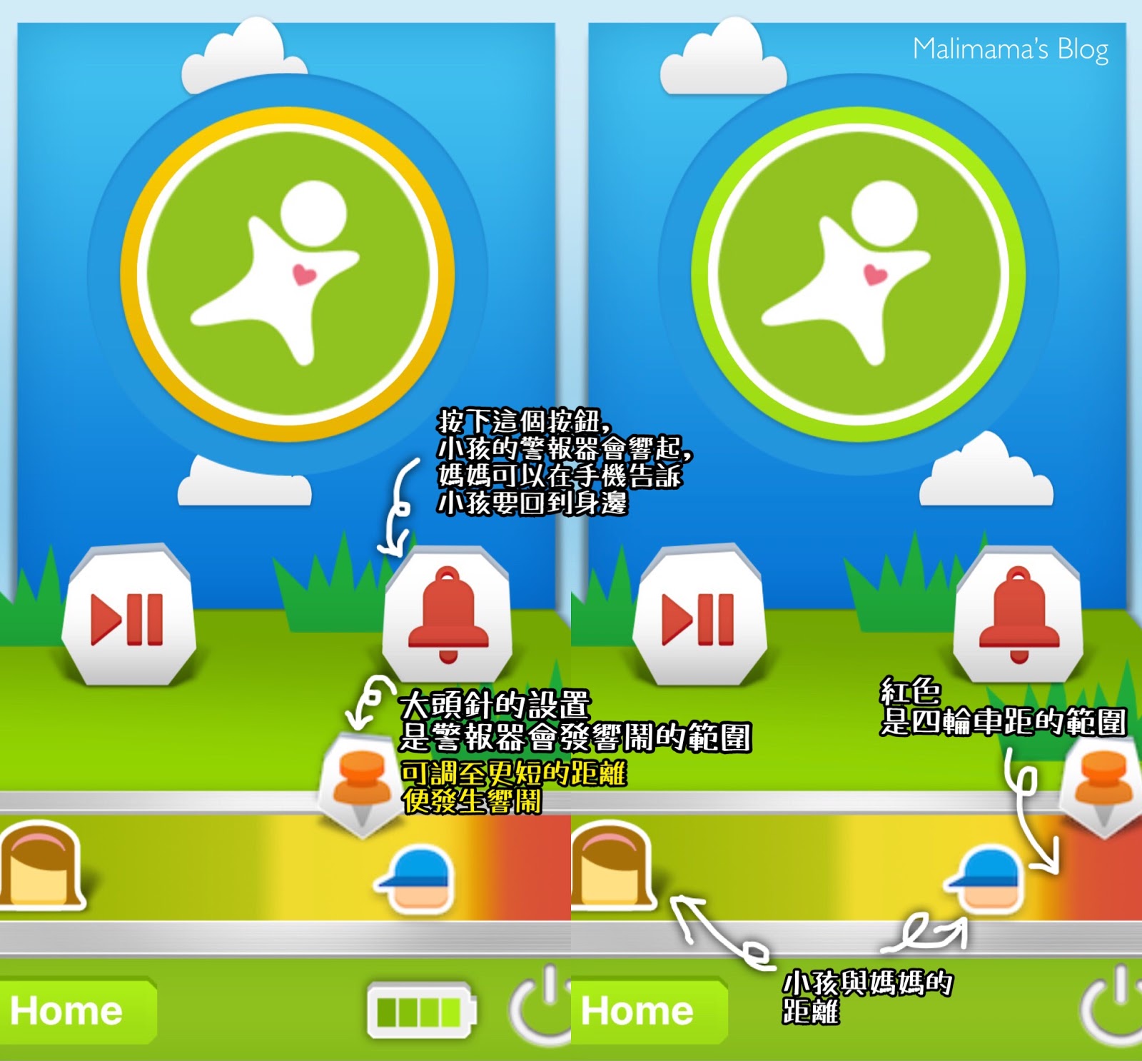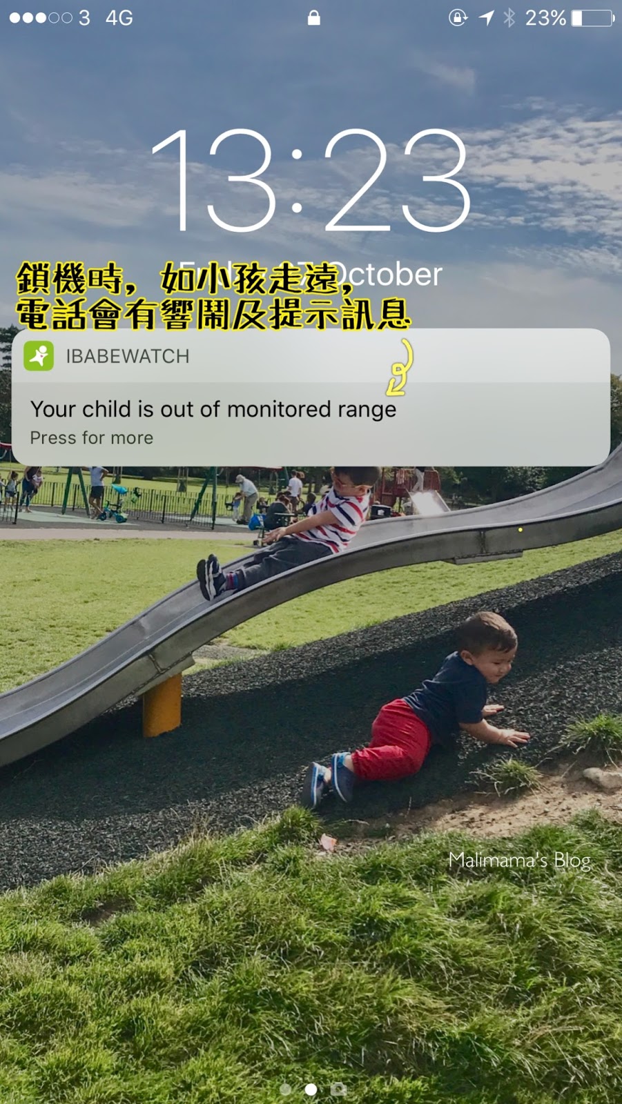 另外,iBabeWatch 的 APP 介面,也有一個 ? 警鐘按鈕,如果媽媽按下這個按鈕,小孩的手錶會咇咇響鬧,也示意小孩,媽媽正在尋找你了,或是媽媽想要你現在回到身邊!這個很容易理解,所以我跟 AJ 實習了好幾次之後,如果我按下警鐘按鈕,他便會立即回過頭來找我了!