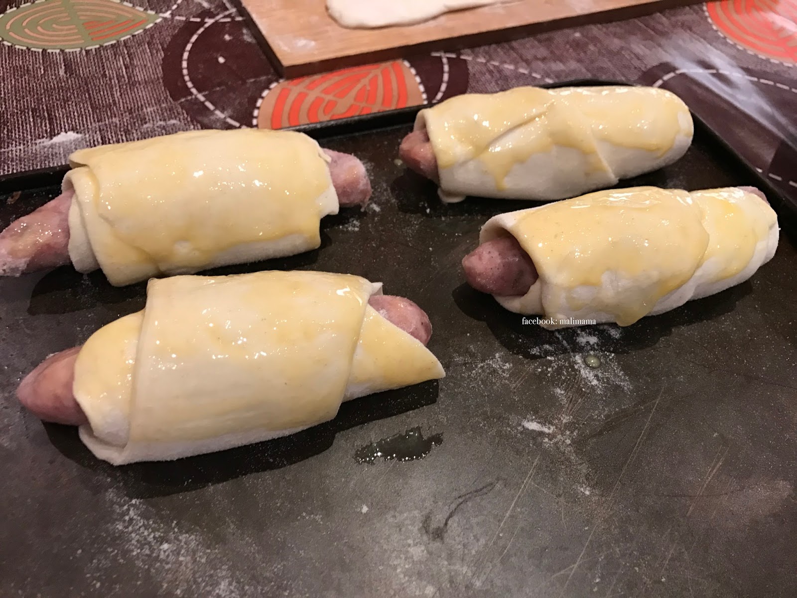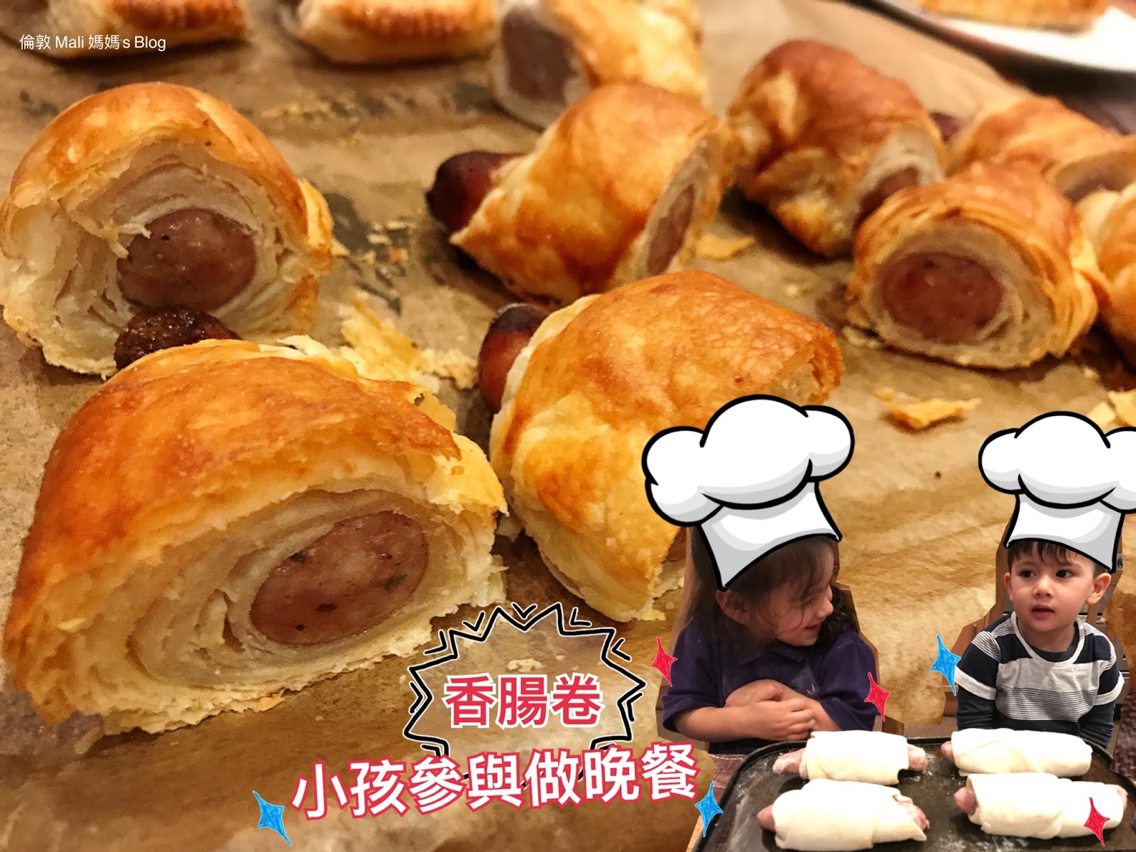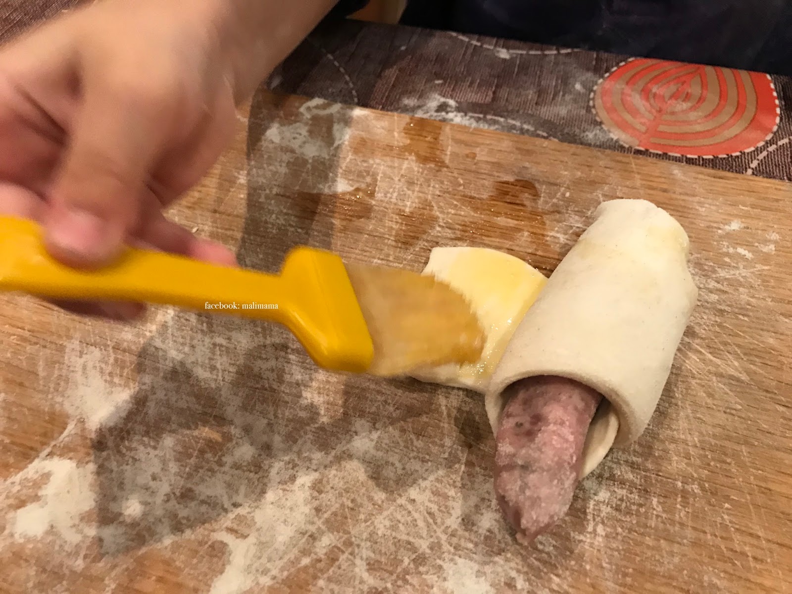 再把肉腸捲進去麵糰內!正式的 Sausage roll ,是只用肉腸內的已調味絞肉(或去超市買專門做香腸的絞肉),不要外面的腸衣,但因為不想他們太直接接觸『生肉』,所以就由他們整條香腸放進去了!