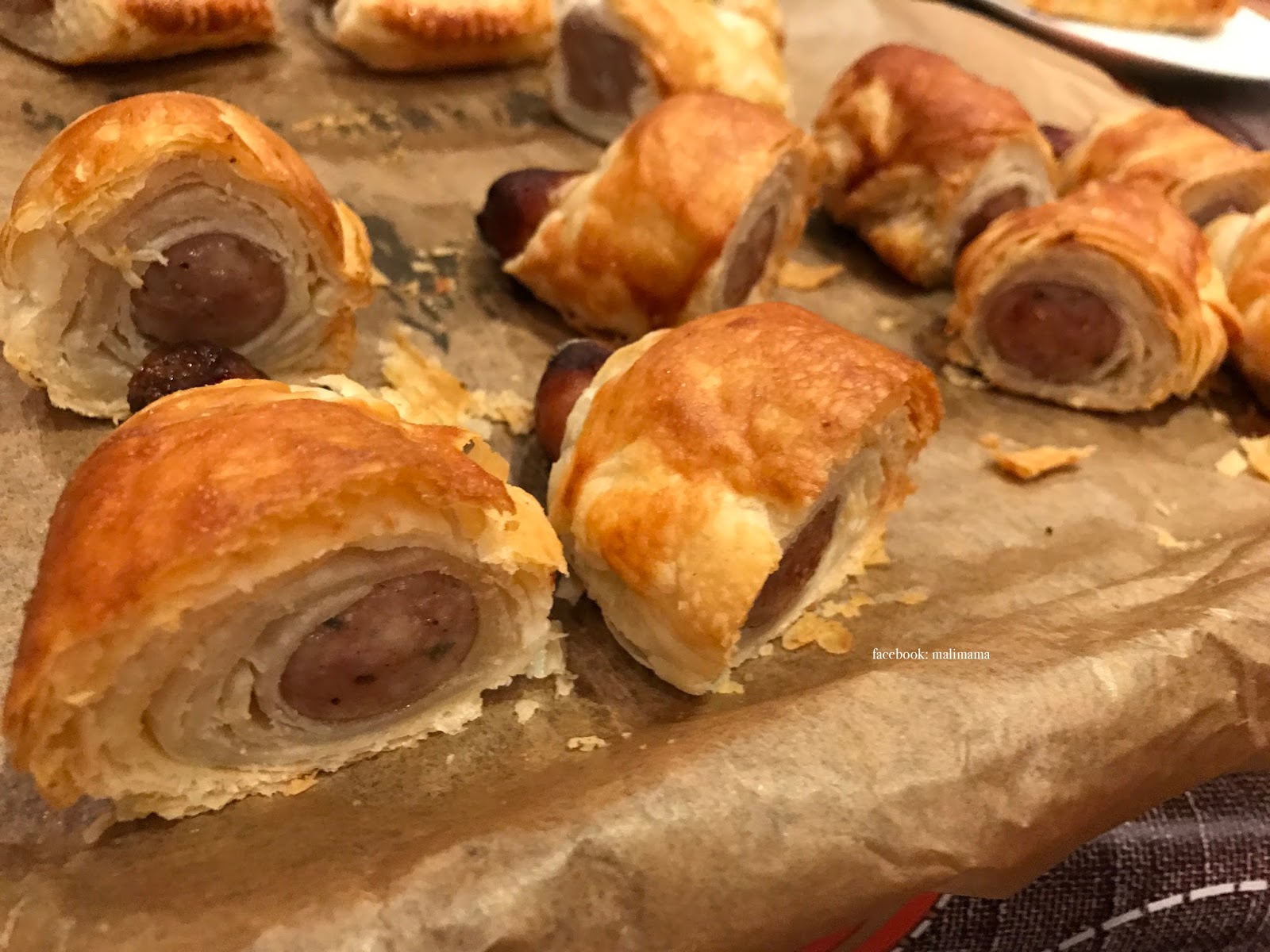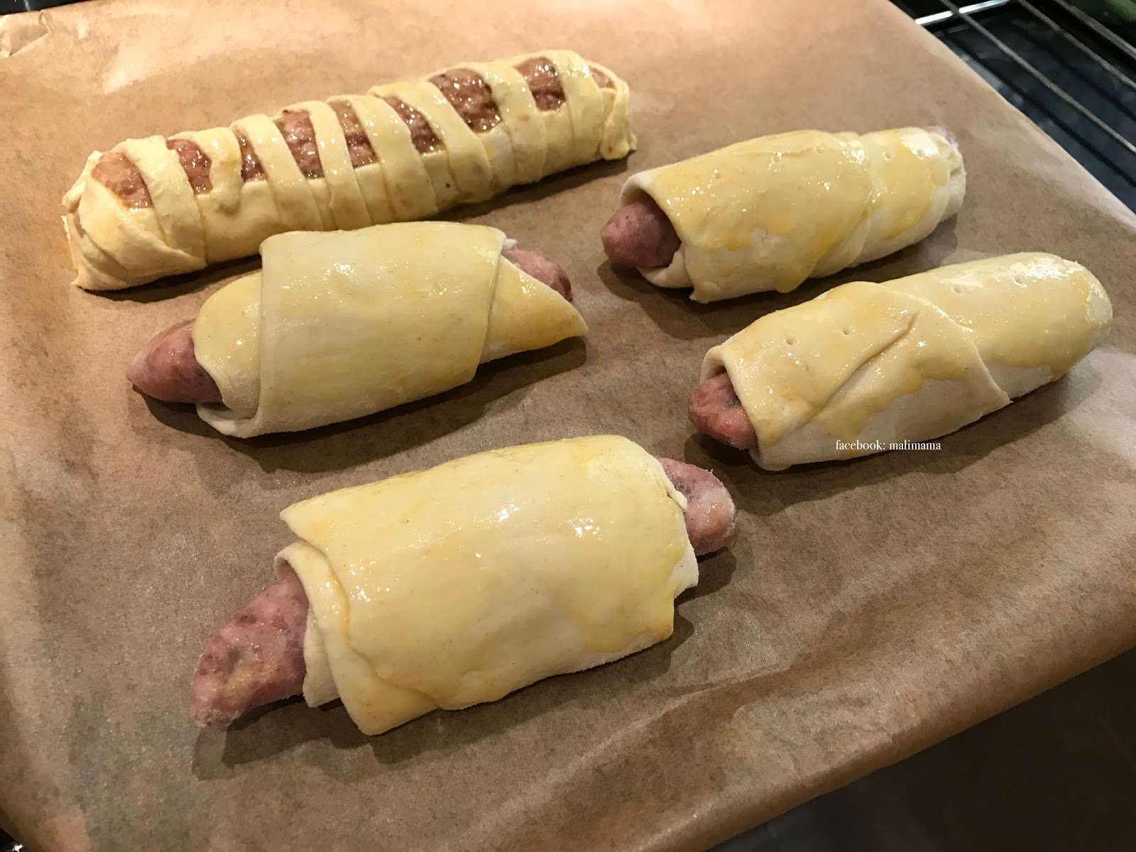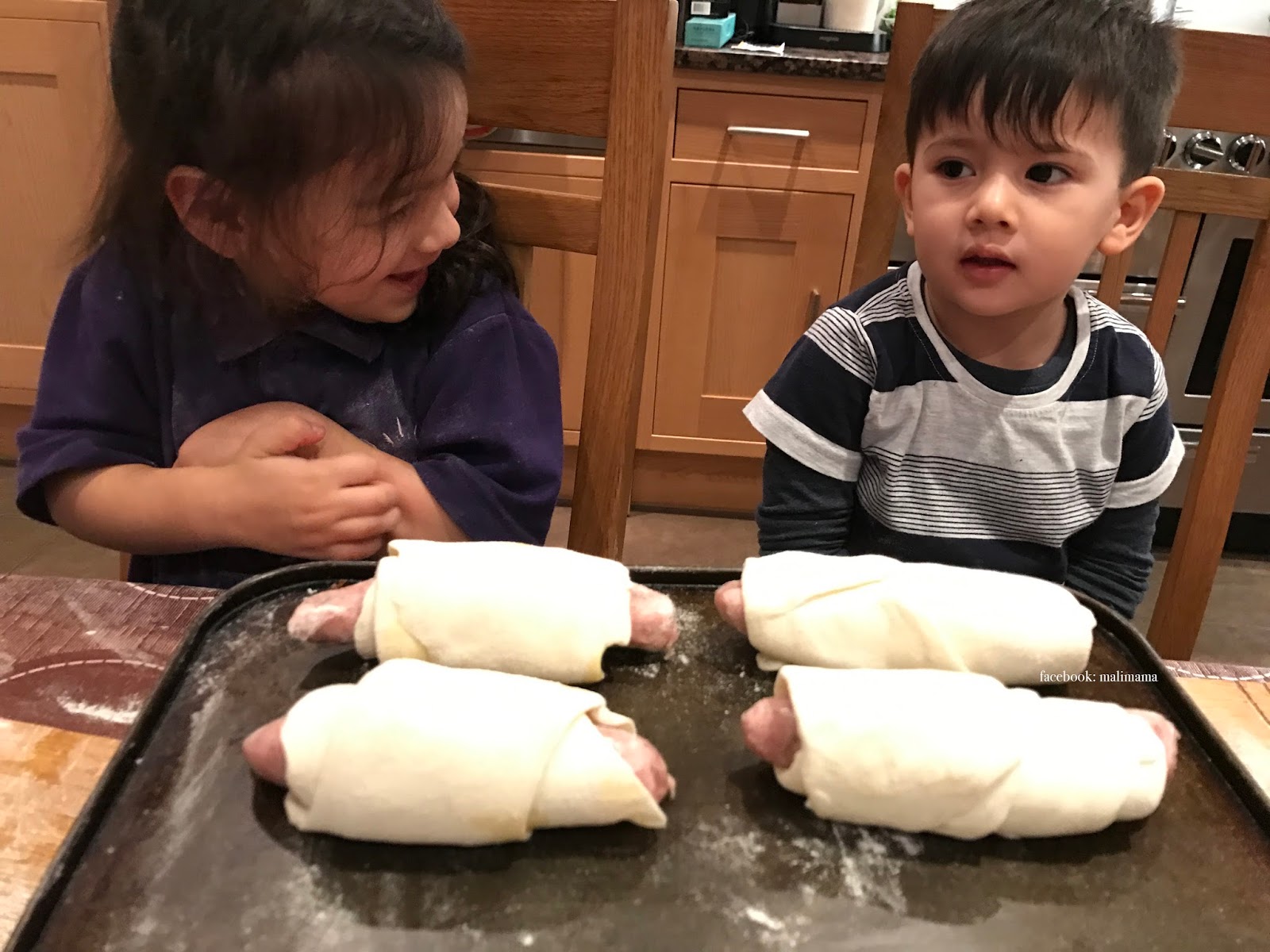 再把肉腸捲進去麵糰內!正式的 Sausage roll ,是只用肉腸內的已調味絞肉(或去超市買專門做香腸的絞肉),不要外面的腸衣,但因為不想他們太直接接觸『生肉』,所以就由他們整條香腸放進去了!