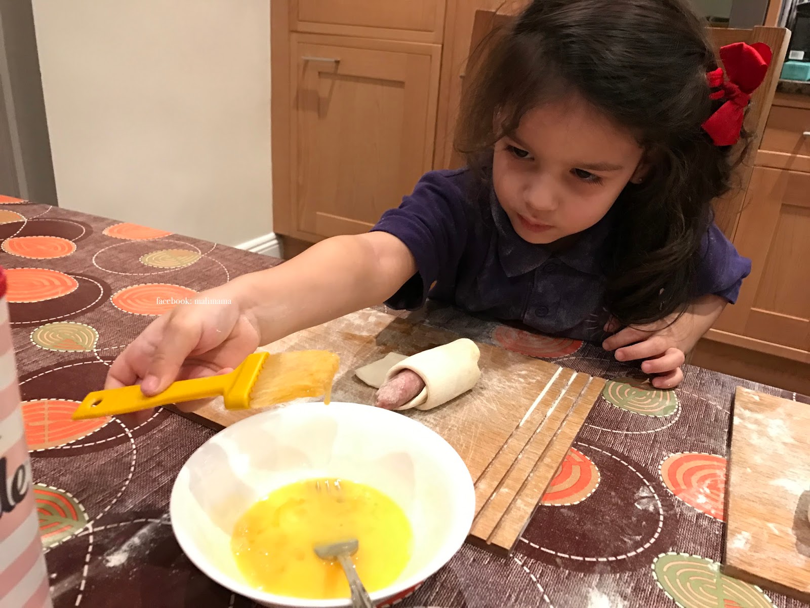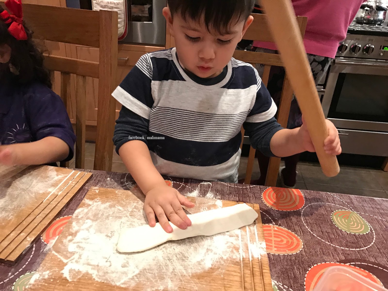 自己思考怎麼捲進去,卻變成了一陀麵糰了(笑),我都讓他們先自己思考怎麼做,之後真的不行,再給提示,當中加點鼓勵:『Good Try』,多說 Good Try,他們會想繼續試一下,不需要壓力,慢慢試,做得很醜也沒關係