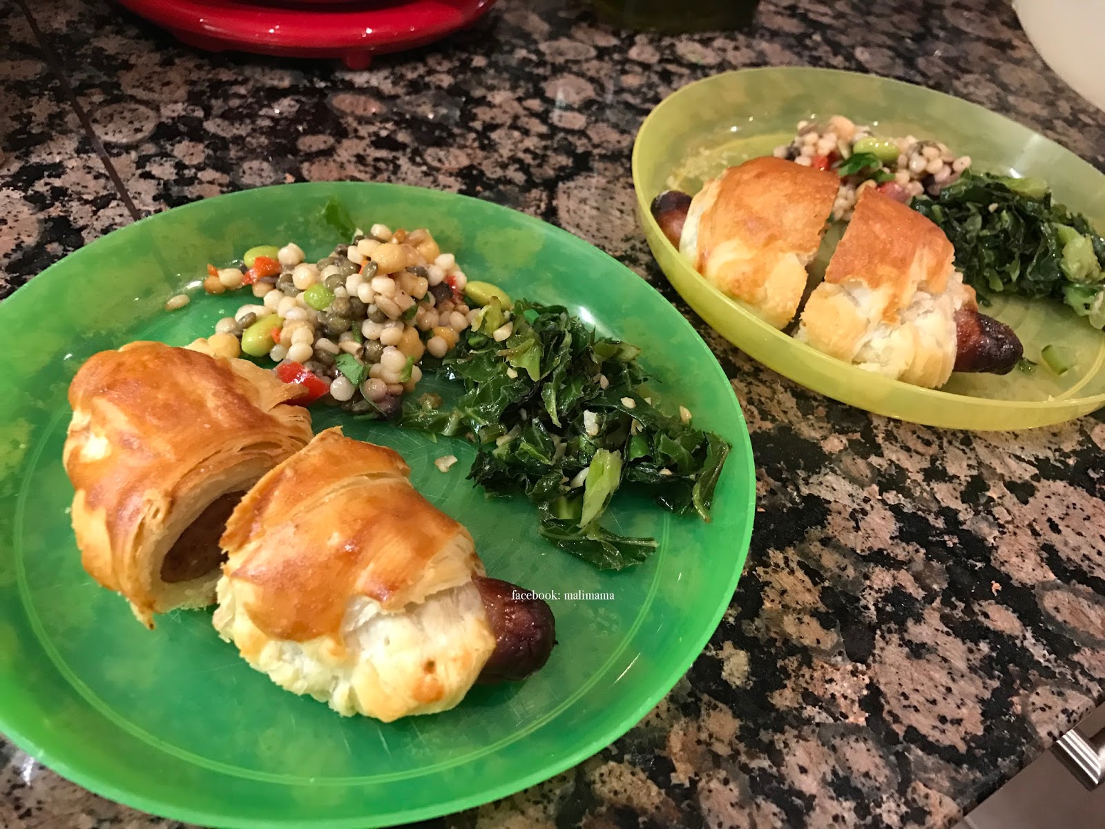 小孩二人的簡便晚餐,有包有肉有菜,有多穀類的 salad